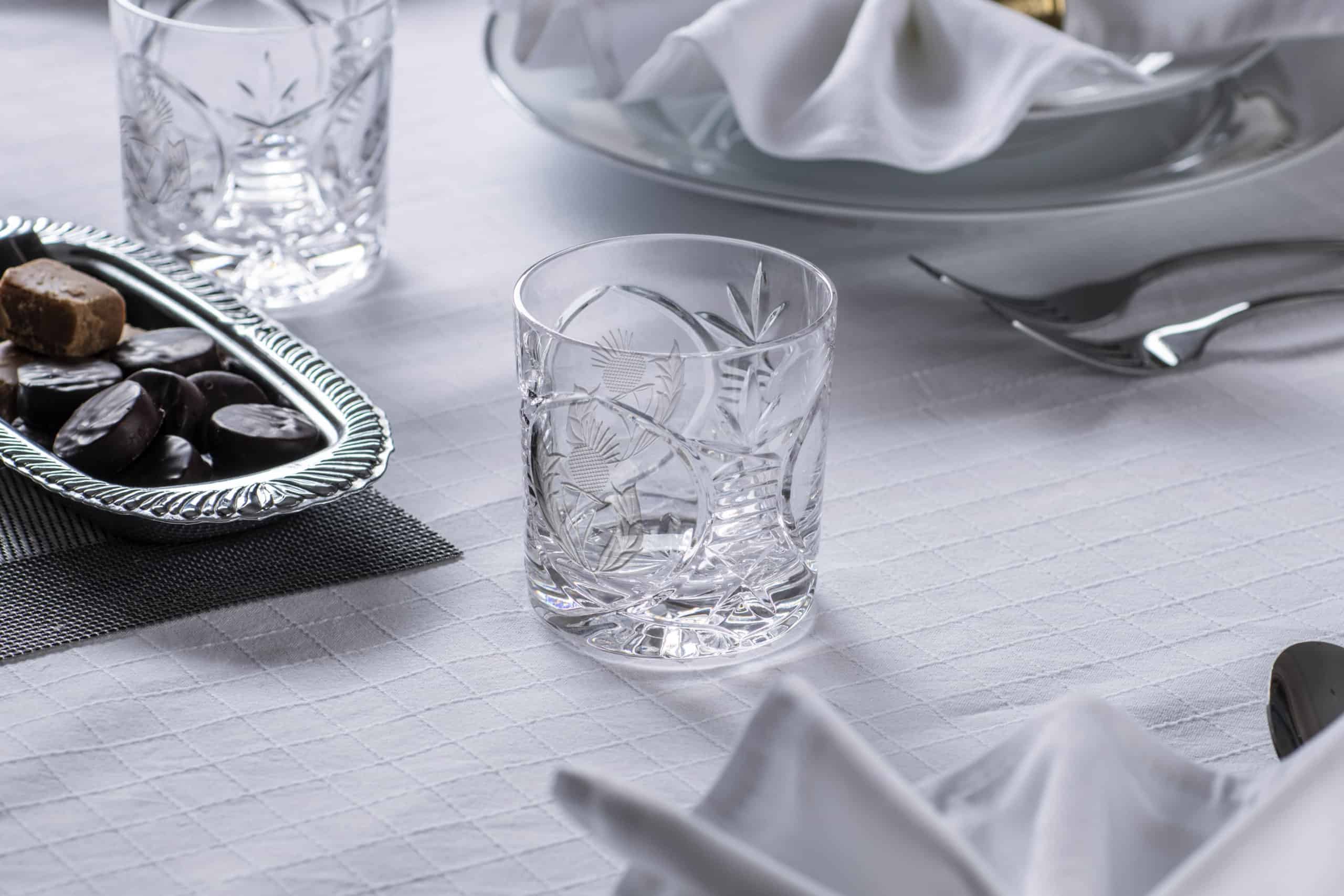 The Bothwell collection features an incredibly traditional yet elegant handcut pattern on high quality mouthblown crystal and was the first glassware range to emerge during the early days of Glencairn Crystal. The whisky tumbler features a thistle cut design on two panels of the glass with one blank panel for optional crystal engraving.