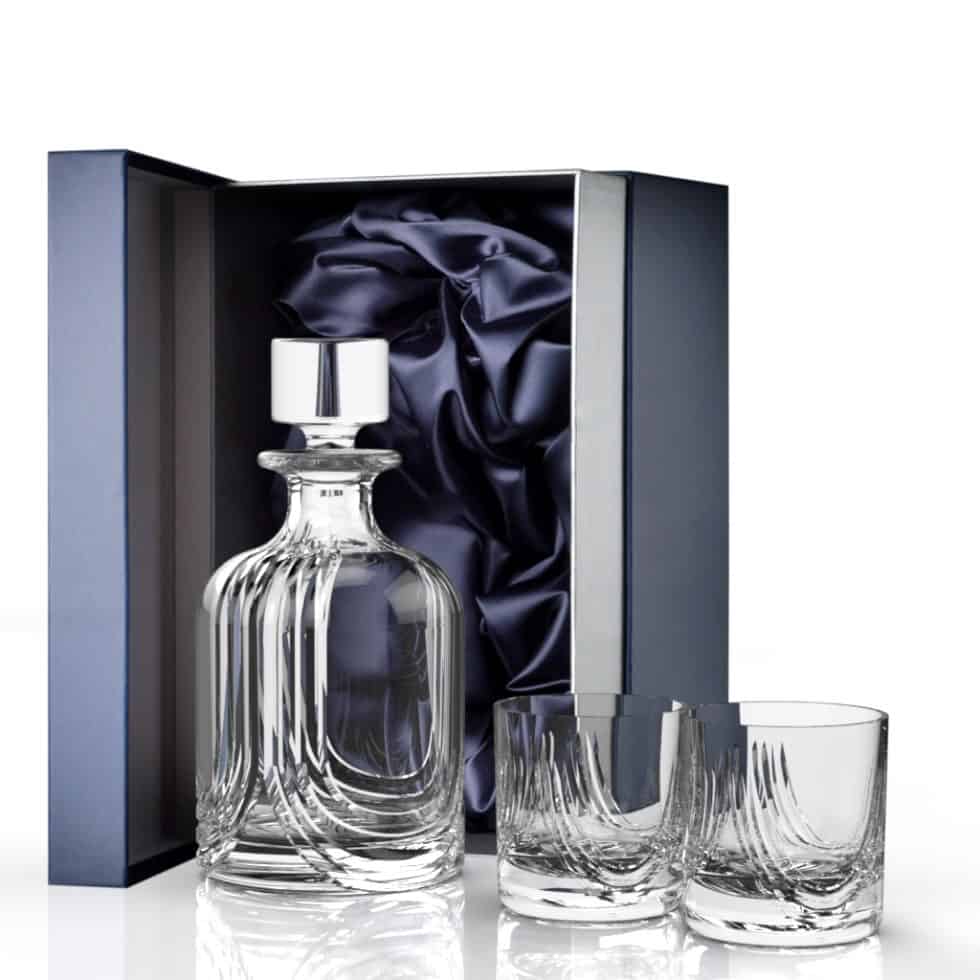 Our beautifully hand cut Montrose suite features sweeping cuts on the glassware inspired by the folds of the Scottish kilt. This beautiful lead free crystal whisky decanter is supplied in a luxurious navy gift box lined with navy satin along with two Montrose Whisky Tumblers, perfect for gifting to a whisky drinker. *Only the decanter will be engraved
