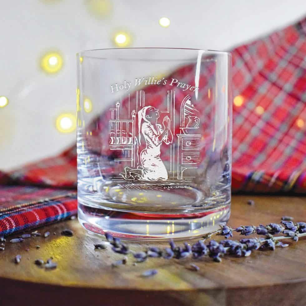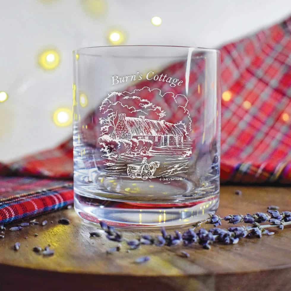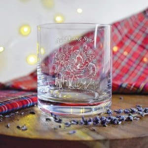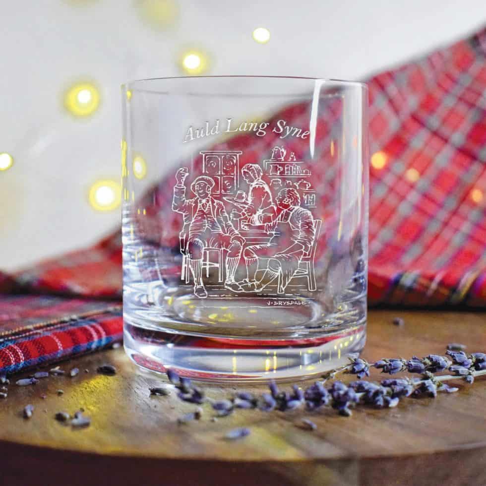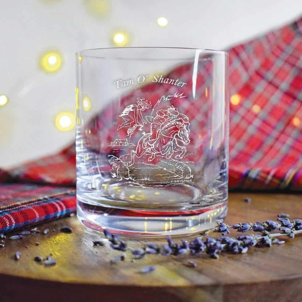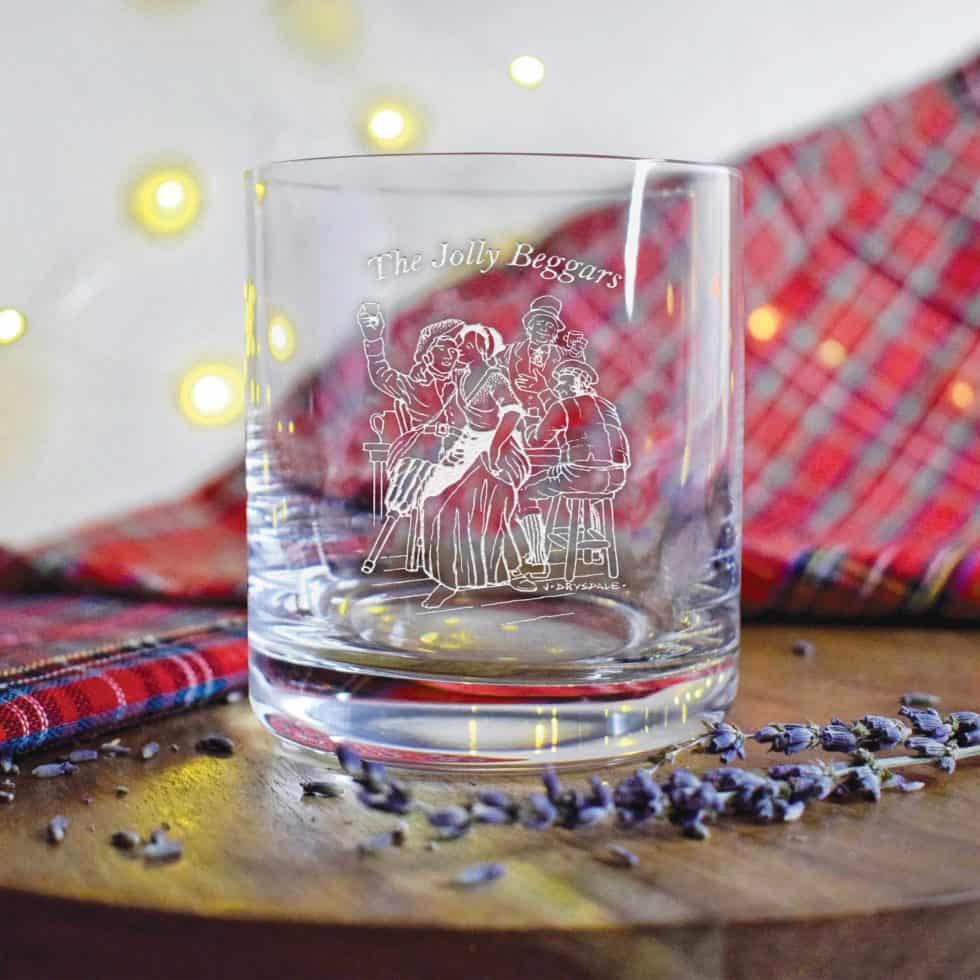 Jim Drysdale was an incredibly talented resident artist at Glencairn Crystal Studio and is regarded by their founder as the ‘unsung hero’ of the whisky world. Although he was exceptional at oil painting still life, portraits and land-scapes, he was also known for being an incredible cartoonist with a wicked strap line! Jim’s artistic interpretation of Robert Burns’ poems are just beautiful and we’re so delighted to now share them with the world. These crystal whisky tumblers designed with Robert Burns inspired illustrations are perfect for appreciating your crystal-clear dram. With room for a couple of ice cubes, this glass can also be used for mixers or a soft drink. Supplied in a luxurious navy gift box lined with navy satin, creating the perfect gift set.