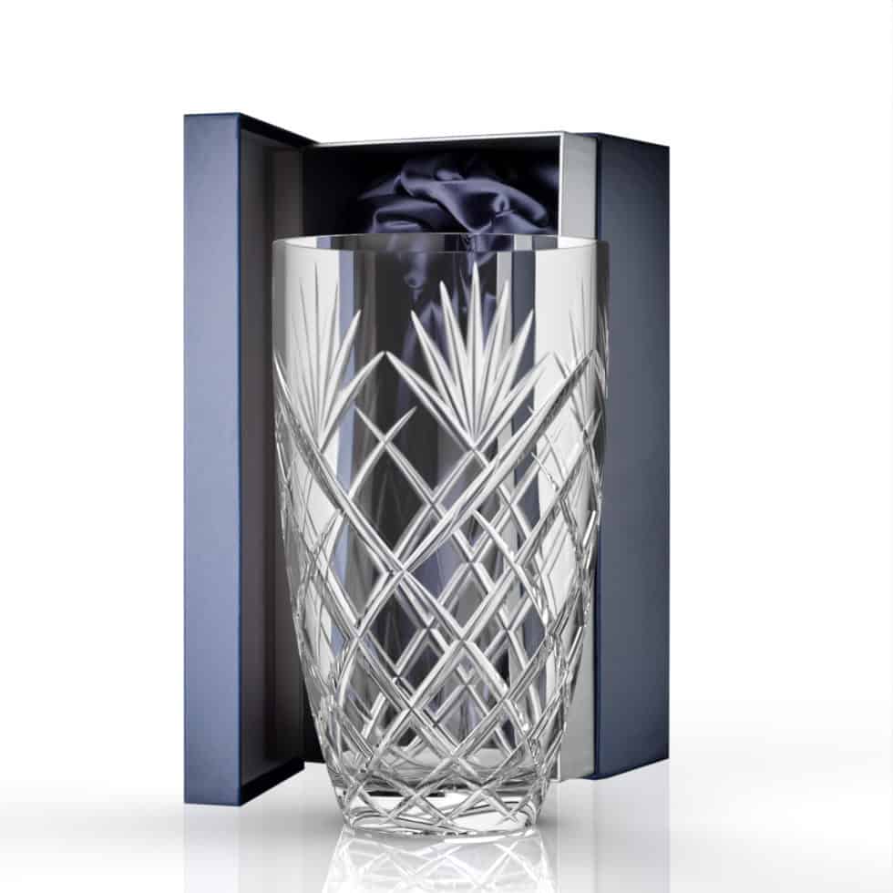 The crystal vase is supplied in a navy gift box, lovely for gifting to family and friends. Also available in sizes Small and Large.